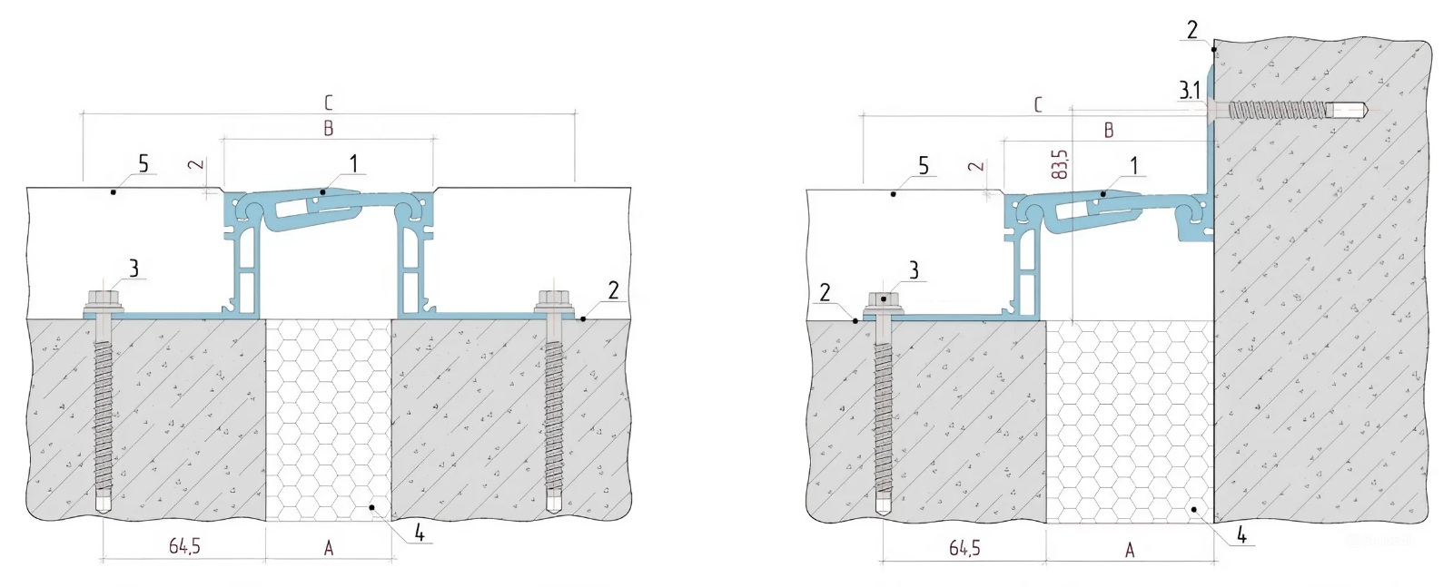 6. После инструментальной проверки положения секций дилатационного устройства тип ДША.Т-0 или ДША.Т-0-УГЛ (поз. 1) (далее – устройства) через монтажные отверстия под анкер-винт с потайной головкой R-LX-08X075-CS (поз. 4) и анкер-винт с потайной головкой R-LX-06X050-CS для элементов конструкций - стен (поз. 4.1) (далее – анкер-винт) наметить промышленным маркером с шагом 180 мм места для бурения отверстий.